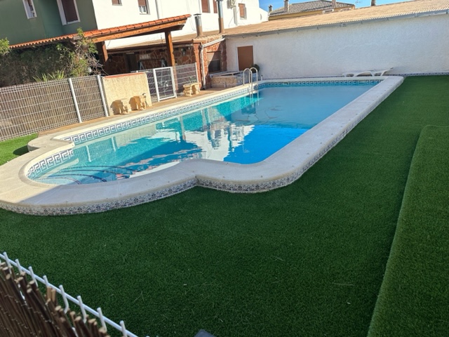 En la planta baja, esta la gran terraza, jardín, piscina de verano y un gran salón con cocina, con capacidad para todos, para estar a la hora de comer y un baño completo.